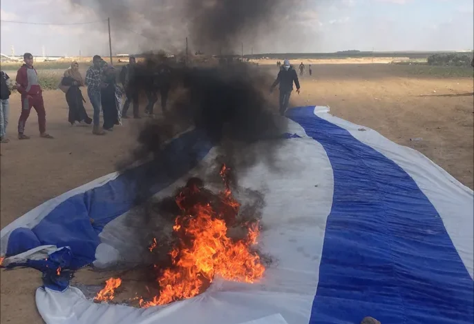 أحمد عبد العال-غزة بحركات سريعة بسط شبان فلسطينيون علما كبيرا لإسرائيل على أرض مخيم العودة قرب الحدود الشرقية لقطاع غزة ضمن الاستعدادات الجارية لجمعة “حرق العلم” في إطار مسيرات العودة الكبرى المتواصلة منذ أسبوعين. وما أن انتهى الشبان من فرش العلم الذي يبلغ طوله عشرين مترا حتى داسه عشرات الأطفال الموجودين بأقدامهم، قبل أن يبدأ شاب ملثم بسكب البنزين على العلم الإسرائيلي لحرقه. ويأتي حرق العلم الإسرائيلي ضمن استعدادات مئات الشبان على حدود قطاع غزة لفعاليات الجمعة القادمة، التي أُطلق عليها “حرق العلم” وسيتم…